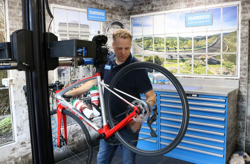 Allereerst wordt gekeken of alles goed vast zit. Met een momentsleutel worden alle onderdelen gecheckt. Crankstel, derailleurs, zadelpen enzovoort. Dan wordt gekeken of alles nog spelingsvrij is. Denk hierbij aan het balhoofd, de wiellagers. De wielen worden gedemonteerd en gecontroleerd of deze nog volledig recht zijn. Soms wil een eigenwijze spaak nog weleens zorgen voor een kleine slag in het wiel. Even de bandjes controleren doet een monteur in een handomdraai tussen neus en lip door.