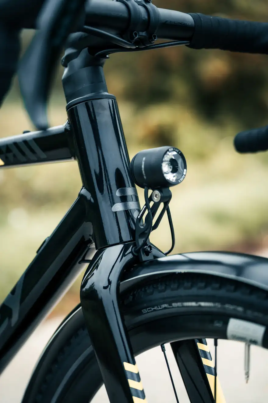 De Kanzo Adventure A EQ is uitgerust met DT Swiss G1800-wielen met naafdynamo, die een krachtige Supernova-voorlamp en een geïntegreerd achterlicht in de Curana-spatborden aansturen. Zo hoef je nooit nog aan batterijen te denken en ben je altijd zichtbaar, dag en nacht. De custom Curana-spatborden houden je droog tijdens regenachtige ritten, terwijl extra reflecterende details op het frame en de spatborden je veiligheid onderweg verder verhogen.