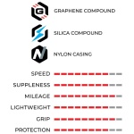 Op races geïnspireerde snelheid en grip: De unieke Grafeen + Silica 2C samenstelling biedt een ongeëvenaarde combinatie van lage rolweerstand, stevige grip in bochten en extra stabiliteit op de zijwanden.